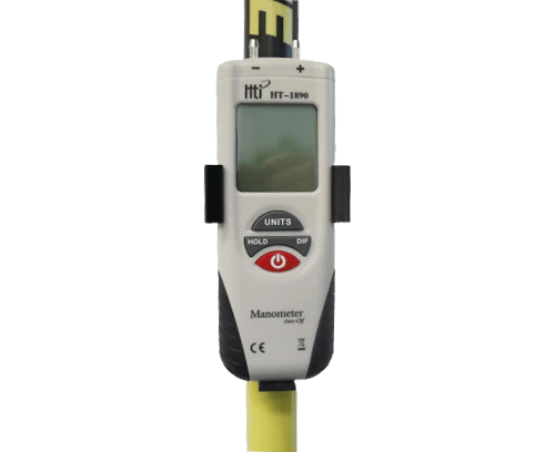 Differential pressure gauge with clip for the HepaZone dust containment cart.